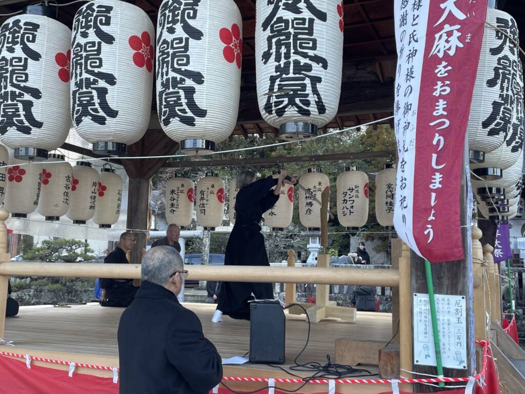 2026年奉納演武 2026年1月4日 武術 新年最初の行事は、今年で3回目となる居合奉納演武。 初詣の参拝客で賑わっていた三田天満神社様で演武してきました。 まずは宮司様に今年一年の安全、健康、発展をご祈祷していただきました。 その後奉納演武へ・・・ 集団型から単独型、相対型。そして最後は真剣を用いた試し斬りへ。 藁が斬れる様子を見た方々から歓声が上がりました。 霰舞い散る寒空の中、剣士の皆様お疲れさまでした。
